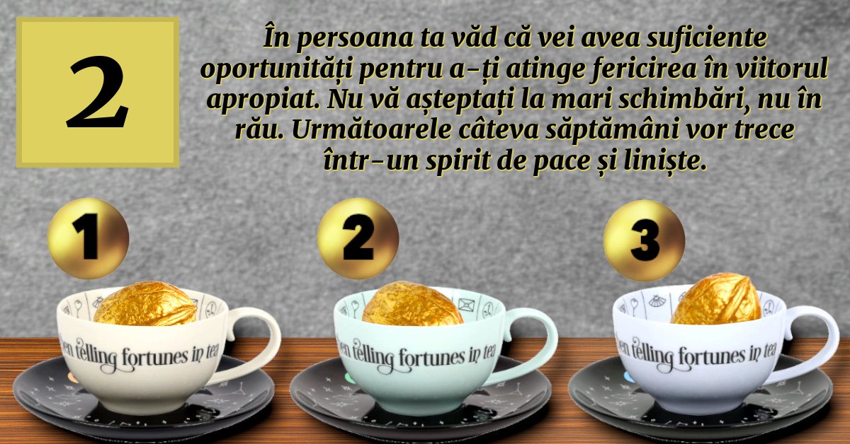 În persoana ta văd că vei avea suficiente oportunități pentru a-ți atinge fericirea în viitorul apropiat. Nu vă așteptați la mari schimbări, nu în rău. Următoarele câteva săptămâni vor trece într-un spirit de pace și liniște.